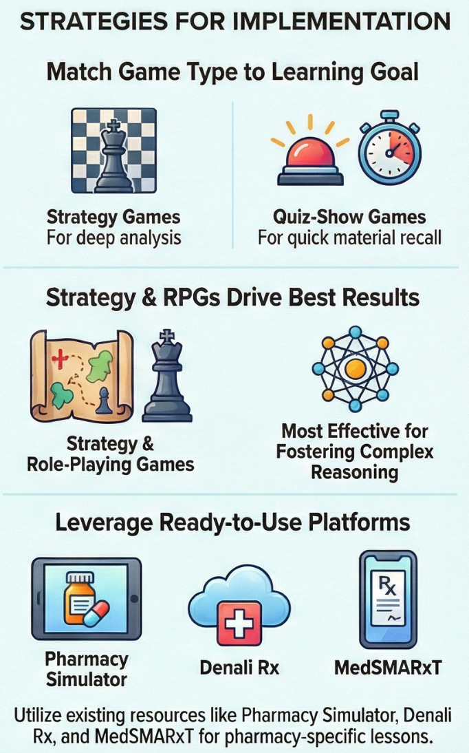 Incorporating games into your teaching is an evidence-based tool to increase active engagement and improve learner performance in practically any setting. Start small. Replace one review session or an active engagement exercise with a game and see for yourself what the benefit are for learners. The great news for pharmacy (and other health professions) educators is that ready-to-use serious game platforms already exist. I encourage you to take advantage of these resources, play a few, and maybe even create your own!