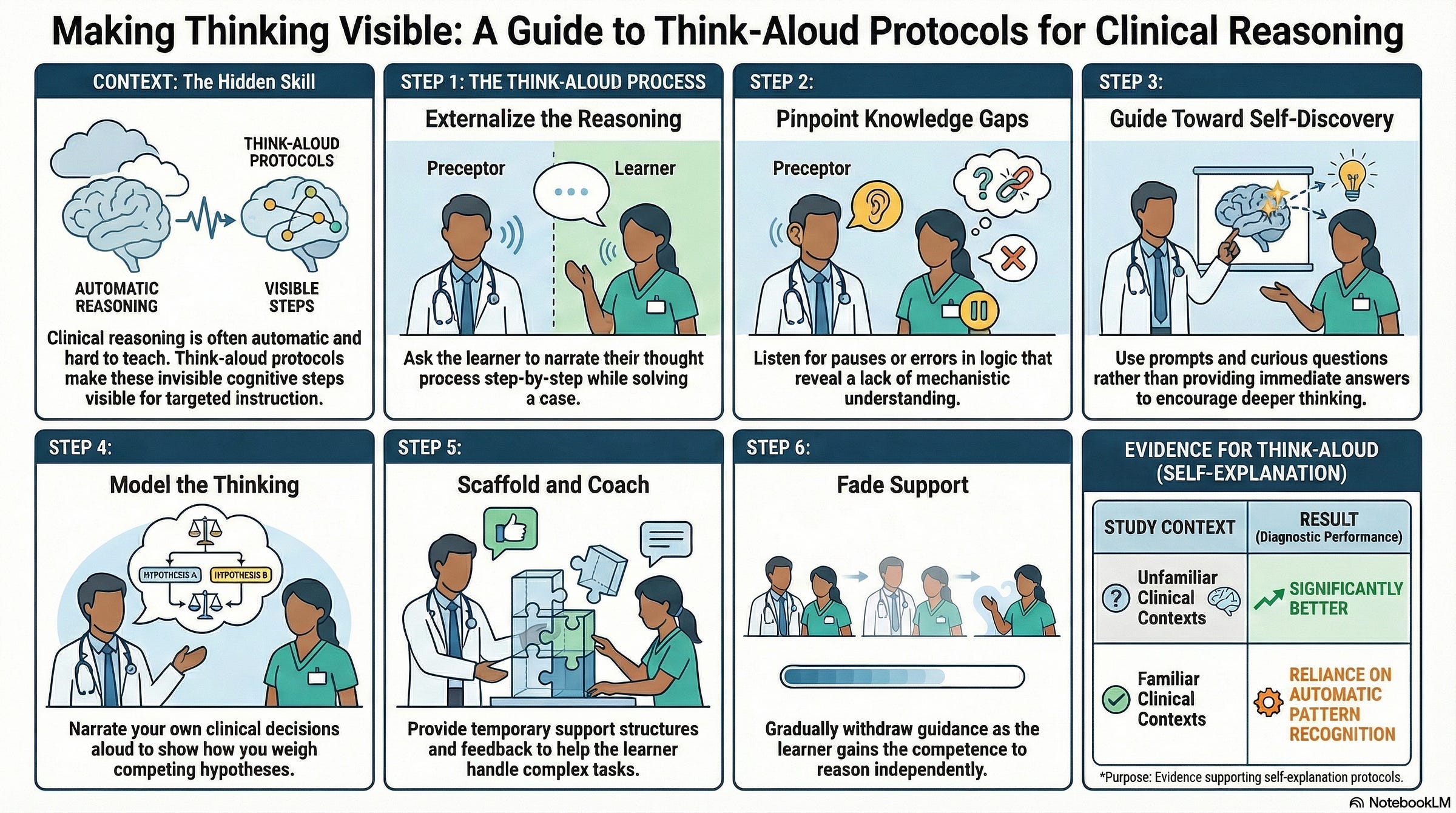 Clinical reasoning develops through deliberate practice and is accelerated when learners’ thinking becomes visible to educators. The think-aloud protocol transforms teaching from guessing at hidden misconceptions to directly addressing observable reasoning errors, showing that learners benefit most when actively verbalizing reasoning and receiving immediate feedback, creating opportunities for preceptors to model expert reasoning in direct response to specific misconceptions.